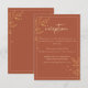 Este cartão de recepção de casamento moderno, simples e terroso no estilo boho apresenta belas folhas douradas e uma combinação de letras em cursiva e simples. Você pode personalizar este design com os detalhes da sua recepção de casamento.