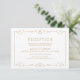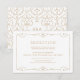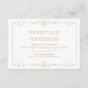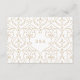 Elegância vintage emoldurada com design de arabescos ornamentados em cor dourada sobre um fundo branco editável. Padrão damasco com desenho de monograma no verso, moderno, elegante e sofisticado, perfeito para casamento vintage, casamento art déco durante todo o ano. Cor do fundo editável para combinar com as cores do tema do seu casamento. Personalize seu próprio cartão de recepção para o conjunto de convite de casamento.