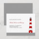 Cartão de recepção de casamento moderno e elegante. Apresenta um farol tradicional em preto, vermelho e branco com uma borda cinza na parte inferior. Ótimo para um casamento a ser celebrado em um farol, praia, costa, mar ou local histórico. Use-o para um grande evento ou uma cerimônia íntima. ENTRE EM CONTATO COM “MARLENEDESIGNER” SE DESEJAR ALTERAR A COR OU O TEXTO DESTE DESIGN.