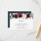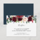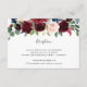 Projetado para coordenar com a nossa coleção de casamentos Radiant Bloom, este elegante cartão de recepção botânica apresenta um spray de burgundy marsala, flores azul-claro e cor-de-rosa-marinho com folhagem verde de eucalipto, tocando seus detalhes de recepção de casamento, local e timing.