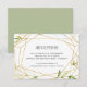 Projetado para combinar com nossa coleção de casamento Terrarium, este cartão de recinto de recepção elegante apresenta uma borda geométrica dourada acentuada com ramalhetes de folhas e folhagens de aquarela verde. Personalize com os detalhes da sua recepção, horário, local e endereço.