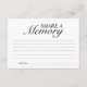 Este cartão simples e elegante de Compartilhar Lembrança é perfeito para um serviço memorial ou celebração da vida. O cartão fornece um espaço para os convidados escreverem suas lembranças favoritas do falecido. O design minimalista, apresentando a frase "Compartilhe uma Lembrança" em uma fonte elegante, permite que as memórias do falecido sejam o centro das atenções.