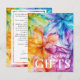 Apresentando a placa vertical "Nota sobre presentes" da "Coleção Eetérea de Bloom", oferecendo aos casais uma forma sofisticada e personalizada de comunicar suas preferências de presentes aos seus queridos convidados. Na frente, posicionada contra um pano de fundo cativante de trabalho de arte de tinta a álcool vibrante, com matizes roxos de blues, roxas, vermelhos, laranjas e verdes, a legante legenda "Nota sobre presentes" imediatamente desenhar a atenção. Este design ponderado convida os convidados a considerar as preferências dos casais em relação aos presentes com graça e estilo. Ao virar para trás, os convidados são recebidos por um fundo branco sereno adornado com uma sutil extensão do trabalho de arte etéreo no canto inferior, criando um design sem soldadura e encantador. Contra esse pano de fundo tranquilo, é fornecido amplo espaço para o casal compartilhar uma mensagem sincera e personalizada. Aqui, eles podem expressar sua gratidão e apreço pela presença de seus convidados, enquanto os guiam gentilmente em preferências de presentes. Seja direcionando hóspedes a um registro ou oferecendo ideias para presentes significativos e pensativos, este espaço permite ao casal comunicar seus desejos com calor e sinceridade. Este cartão vertical "Note on Gifts" da "Ethal Bloom Collection" oferece uma maneira sensata e elegante de os casais transmitirem suas preferências, garantindo que todos os aspectos de suas celebrações de casamento estejam imbuídos de beleza, personalização e um toque de talento artístico.
