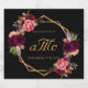 Um fundo preto chic com uma falsa estrutura geométrica dourada. Decorados com flores roxas escuras e burgueiras, rosas e penas do estilo "boho". Personalize e adicione seu monograma, suas iniciais e sua data de casamento. Seu nome familiar é inicial no meio com letra maiúscula. Letras coloridas com ouro.