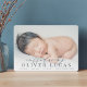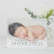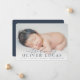 Um elegante design de anúncio de nascimento que apresenta um cheio sangrando uma foto horizontal ou orientada a paisagem com "introduzindo [name]" na parte inferior do roteiro de caligrafia e letra de serifa clássica. As estatísticas de nascimento do seu bebê e a assinatura da sua família aparecem abaixo. Adicione três fotos quadradas adicionais no verso.