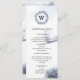 Belo e elegante menu de janto de Natal personalizável na paisagem de inverno com cor d'água, com uma camada azul de folhagem de inverno segurando um monograma personalizado. O estilo fino da placa tem espaço suficiente para todas as informações necessárias. Personalizar com detalhes de menu e ocasião em campos fornecidos com fonte minimalista sans serif.