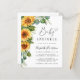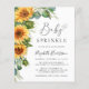 Este convite à aspersão para bebês, amigável em termos de orçamento e neutro em termos de gênero, apresenta buquês de aquarela de flores de girassol e verde de eucalipto e "Bebê" em um roteiro de na moda com um inchaço cardíaco.