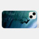 O caso IPhone 14 é mostrado com uma impressão de foto de um surfista cavalgando a onda. Personalizar ou comprar como está. Imagem do stock
