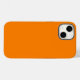 Um iPhone 14 de cor média e sólida "Laranja". Esta laranja é pura laranja. Clique em "Personalizar" para mudar de cor ou para adicionar um padrão ou design. Código hexadecimal do produto: #ff7f00