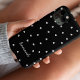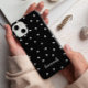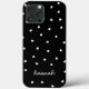 Este caso de monograma preto e branco apresenta um padrão com pequenos corações brancos sobre um fundo preto. Personalize-o com seu nome ou iniciais em uma fonte de script manuscrita.