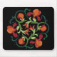 Trabalho de arte de Iris, uma bela imagem, floresce em vermelho e laranja entrelaçados com tons de folhas verdes colocados sobre um fundo preto.
