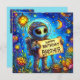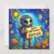 Um astronauta alienígena giro, comemorando o aniversário do irmão. As saudações no cartão são "Feliz Irmão de Aniversário". Na parte traseira da placa está uma pequena versão da imagem frontal e muito espaço para escrever uma mensagem. Feito com o auxílio do AI Bing.