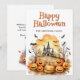 Feliz cartão de Halloween com ilustrações aquáticas de morcegos, jack o’lanternas e fantasmas. Personalize facilmente este cartão de Dia das Bruxas com seu nome e texto de família.