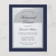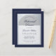 Um janto de ensaio moderno. Em um fundo retangular azul marinho, ele tem um arco azul-prateado falso que tem um marinho de texto azul sobre fundo branco. As palavras Janto de ensaio e os nomes são escritos num guião caligráfico elegante; a primeira linha é o texto arquivado.