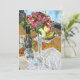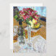 Mesa com vinho, garrafa de vinho e flores em vaso