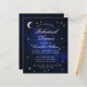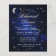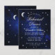Um convite de jantar de ensaio econômico para um tema de casamento celestial, com a lua e a estrela em um fundo azul de noite estrelada. O título Jantar de Ensaio e os nomes são escritos em uma elegante caligrafia. A lua e as estrelas são em fólio prateado falso, o texto é branco. No preto, há apenas a lua e a estrela em um fundo azul de noite estrelada.