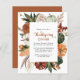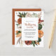 Este convite de Ação de Graças apresenta uma estrutura cornucópia com texto elegante simples para suas informações. A parte traseira apresenta fundo castanho sólido. Perfeito para convidar convidados a jantar.