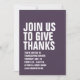 Com uma tipografia branca ousada, este convite jante de Ação de Graças roxo é facilmente personalizado e dá o tom para um banquete divertido e casual do dia de peru