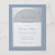 Um janto de ensaio moderno. Em um fundo retangular azul empoeirado, ele tem um arco de folha de alumínio prateado falso que tem dentro azul empoeirado sobre fundo branco. As palavras Janto de ensaio e os nomes são escritos num guião caligráfico elegante; a primeira linha é o texto arquivado.