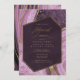 Você tem o glamour e o alto impacto com este conjunto de casamentos coordenadores que apresenta padrões abstrato agate, texturizados com falso-cristais e destaques em folha de ouro falso e brilhante. Combinações de cores impressionantes, como esta suíte com sua paleta luxuosa de uva mutada e mauve a rosa-orquídea macia, criam o fundo das peças dessa coleção coordenada. Este elegante convite de janto de ensaio apresenta tudo isto com um rótulo hexágono e semitransparente para guardar o seu texto. É fornecido um modelo para adicionar facilmente os detalhes do evento. Veja o link de coleção nesta página para ver todos os itens correspondentes neste belo design ou ID827 de pesquisa para ver opções de cores adicionais para este design.