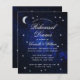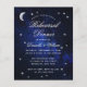 Um convite de janto de orçamento para um tema de casamento celeste, com a lua e a estrela num fundo azul estrelado. O título Janto de ensaio e os nomes são escritos em um roteiro caligráfico elegante. A lua e as estrelas são folha de prata falsa, o texto é branco. No preto, há apenas a lua e a estrela num fundo azul-noturno estrelado. A foto noturna estrelada é de Felix Mittermeier, de Pixabay, e está livre para uso comercial.