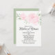 Convites de casamento lindos, elegantes e formais começam com rosas rosa pinceladas e leves que quase se derretem na página. Eles estão cercados por apenas um toque de folhas verdes macios. O Janto de ensaio é escrito em um script de fluxo de ornamentado. O resto do texto é uma fonte simples, mas moderna. A parte de trás deste convite elegante é verde de sábio macio com um padrão de folha muito sutil. Este convite é perfeito para um casamento de primavera, verão ou jardim.
