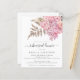 Um valor para o alternativo do ORÇAMENTO em tamanho menor de 4,5 x 5,6" de semirbrilho de 110 lbs, que é de espessura semelhante a um cartão postal (no entanto, não é adequado para uso como cartão postal). POR FAVOR, NOTE que existe UM por folha. Janto de Ensaio Florais Rosa-Rosa de Orçamento Convite. Flores cor-de-rosa estilo boêmio moderno, samambaias-palha-pampas e folhagem descem do canto superior direito. Janto de ensaio num script de escrita manual. Personalize facilmente o texto para seus próprios detalhes.
