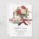 O nosso convite para o janto de Natal apresenta uma elegante zona de janto de férias e um belo arranjo floral de poinsettia vermelha com velas e fita vermelha. O convite é simples e elegante, com fundo branco e texto preto.