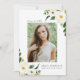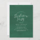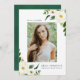 Na moda, elegantes convites para festa de formatura de fotos com buquês de cor d'água floral branca com sotaques verdes esmagadores nos cantos do convite. Personalize os convites para festas de formatura quic adicionando a foto do formando, o ano de graduação e o nome da escola. O lado inverso da festa de formatura convida a incluir espaços reservados para os detalhes de sua festa personalizada e um fundo verde-escuro de cor d'água. Perfeito para graduações de primavera!