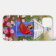 Uma cena lindamente pintada de cardeais vermelhos fazer sua casa em uma brilhante casa de pássaros azuis cercada por um jardim florescendo com madeira de cachorro e flores coloridas cor-de-rosa, vermelha e do cosmos branco. Trabalho de arte realista criada de uma pintura do artista da vida selvagem Crista S. Forest.