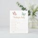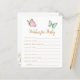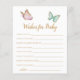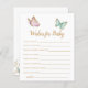 O chá de fraldas do tema da borboleta bonita deseja um cartão para bebês com uma borboleta verde rosa e menta. Há flores e verde na parte de trás do cartão. Os textos são editáveis. Atividade perfeita para jogar durante o chá e definitivamente será um excelente!