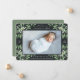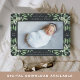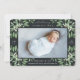 O anúncio de nascimento botânico elegante, em tons chic de verde, apresenta uma foto horizontal ou paisagística de cheio sangrando com solteiro, com polos de delicadas folhas verdes de salsicha e bagas brancas nos cantos, contra um rico fundo de carvão vegetal. Personalize com o nome do bebê, estatísticas de natalidade e uma mensagem pessoal, e adicione três fotos quadradas adicionais às costas.