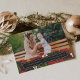 O cartão com fotos elegante apresenta sua imagem favorita com uma borda de flores vermelhas poinsettia, folhagem verde festiva e pequenas flores brancas. Personalize com sua saudação personalizada, seu(s) nome(s) e o ano, depois adicione duas fotos adicionais e mais texto no verso, em um plano de fundo padrão correspondente.
