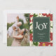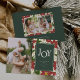O cartão com fotos elegante apresenta a sua imagem vertical ou orientada para retratos favorita à esquerda. "JOY" aparece à direita, junto com seus nomes familiares e ano, em um fundo botânico vermelho e verde de inverno que incorpora flores vermelhas de poinsettia, folhagem verde e minúsculas flores brancas em um rico fundo verde caçador. Personalize as costas com duas fotos adicionais e uma mensagem de Natal pessoal, se desejado, acentuadas com um padrão de coordenação.