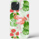 Design de padrão aquoso com flores e aves flamingos, monstera e palmeiras.