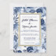 Um lindo padrão floral de índigo azul suavemente rodeia uma estrutura de ouro moderna. Para o sotaque adicionado, o dentro do quadro de ouro é acentuado com uma borda azul indigo. Os nomes dos casais de casamento estão em uma fonte azul marinho dramática e ousada. O restante texto encontra-se em texto de cinza azul. A parte de trás do convite para o casamento é índio azul. Ele apresenta um arranjo floral azul claro e os nomes dos casais de casamento abaixo.