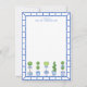 Esta placa de anotação cônica tem 5 topiários diferentes em potes de chinoiserie. A borda ao redor da placa é um quadro de bambu azul. Você pode personalizar com seu nome. A parte traseira da placa tem um padrão de fechamento diagonal com pequenos arcos azuis.