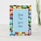 Um close up de grãos de geleia de cor pastel no fundo e uma caixa azul com uma borda branca aguarda sua mensagem pessoal.