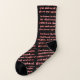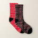 Estas meias apresentam a escritura bíblica "Jeremias 29:11" KJV com uma fonte em negrito e tema de duas cores a meia vermelha tem letras brancas a meia preta tem letras brancas contorno vermelho neste estilo de estampa total mistura e combina, todas as meias são feitas usando tamanho unissex.