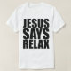 O Jesus Cristo disse que "está terminado" quando comprou nosso salvação com seu próprio sangue - assim que relaxe! Pare de tentar imprimir o deus com seus esforços religiosos. Deixado todos saiba que você é apenas chillin com JC agora com este t-shirt. O t-shirt é uma decolagem do "Frankie famoso diz relaxa" o t-shirt do anos 80 por "Frankie vai-lhe Hollywood" (mas soube que já não fez você;)