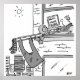 Cartoon Engraçado Jogador de Trombone. O músico é visto através de sua janela plana alta com seu trombone saindo da janela aberta. Ele prendeu sua lavagem ao trombone. Imagem engraçada de desenho preto e branco.