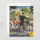 Ilustração Vintage mostra crianças imagem com um policial atuando como uma guarda de cruzamento ajudando um monte de crianças, um jogador de beisebol esportivo, a atravessar uma rua em segurança. O prédio da escola está atrás deles e um letreiro infantil lento está no canto.
