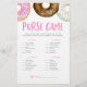 Verifique na bolsa os itens da lista. A pessoa com mais pontos é a vencedora! | Adicione este cartão de jogo "O que na sua bolsa" ao seu chá de fraldas. Esta placa de jogo trivia apresenta rosquinhas cor-de-água cor-de-rosa, branca e chocolate com bordas coloridas. Personalize adicionando nomes, eventos e datas. Este jogo de bolsa de rosquinhas é perfeito para uma chá de fraldas de Menina.