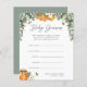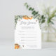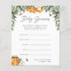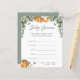 Deixem os chás de fraldas terem suas melhores palpites na data e hora de aniversário, peso e comprimento do bebê! Coloque uma pilha na entrada do evento, passe-as ou deixe uma em cada lugar. Faz uma manga divertida para a mamãe ser, também, quando compilada em uma caixa bonito ou um encadernador. Projetada para combinar a nossa coleção de chás de fraldas de Mel de Flor Laranja, esta natureza de verão inspirou a design com folhagem de aquarela verde, um boião de mel, e minúsculas ilustrações de abelha de mel. Personalize com a mãe o nome e a data do chá de fraldas ao longo da base.