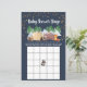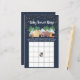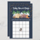 Jogo de bingo de bebê, doce e rústico, apresentando uma ilustração de cor d'água fofinha de animais da floresta com sua tenda acampando sob um céu escuro azul estrelado nas montanhas e na floresta e "Bingo Chá de fraldas" em uma escrita branca.