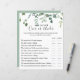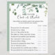 Este jogo de chá de bebê folhagem verde acima ou abaixo é a atividade divertida perfeita para um chá de bebê simples. O design apresenta ramos e folhas de eucalipto botânico elegante desenhados à mão em aquarela, dispostos em belos buquês e padrões geométricos.