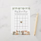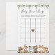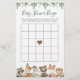 O cartão de jogo do chá de fraldas bingo de animais da floresta tem o tema " bingo", ilustrando a cor d'água e a cor d'água verde eucalipto garland e uma elegante letra de estilo manuscrito.