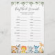 O cartão de jogo de palavras chá de fraldas com tema "jungle" apresenta uma ilustração de safari com cores aquáticas, animais da selva e verde-aquarela eucalyptus garland e uma elegante fonte de estilo manuscrito.