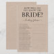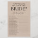 Esta linda e rústica folha de jogo "Quão Bem Você Conhece a Noiva?" para chá de panela é simples e encantadora - perfeita para qualquer chá de panela. Este jogo divertido e fácil certamente trará muitas risadas para qualquer chá de panela. Basta dar uma folha a cada convidado (não esqueça as canetas) e divirta-se! Você ficará surpreso com quantas pessoas realmente sabem algumas das respostas.