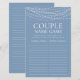 Esta adorável e empoeirada luz azul Casal Name Game chá de panela é simples e encantadora - perfeita para qualquer chá. Este jogo fácil e divertido traz muitas risadas a qualquer chá de panela! Basta dar uma folha a cada convidado (não se esqueça das canetas) e deixar a diversão começar! Ficará surpreso com quantas palavras longas as pessoas inventam usando os nomes da noiva e do noivo. Em segundos você pode ver como sua folha de jogo ficará. Basta selecionar Personalizar este Modelo e digitar o nome da noiva e o nome do noivo.
